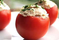 Se ahuecan los jitomates y se les pone un poco de sal y pimienta y se dejan en el refrigerador. Aparte se conserva el jugo del jitomate y las semillas que se quitaron y se mezclan con las yemas de huevo ya cocidas, la sardina, perejil picadito y desde luego desinfectado, sal y pimienta al gusto y se lleva al procesador. Si no tiene, en un molcajete a que quede bien tersa. Se sacan los jitomates y se rellenan de la mezcla. Se adornan con un champiñón.